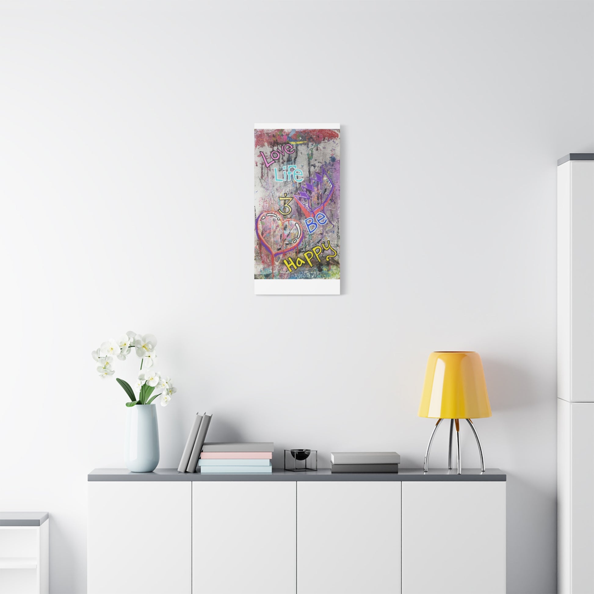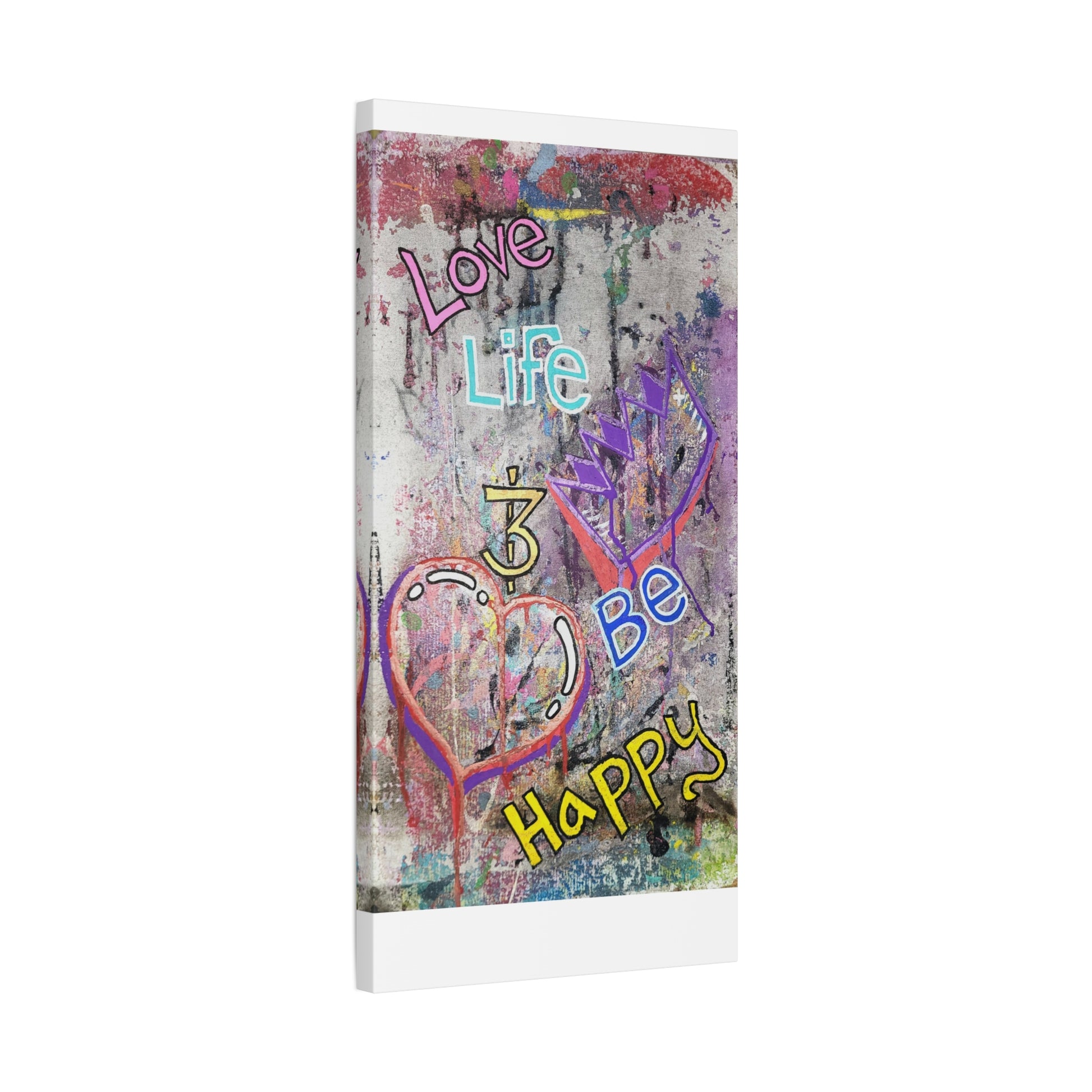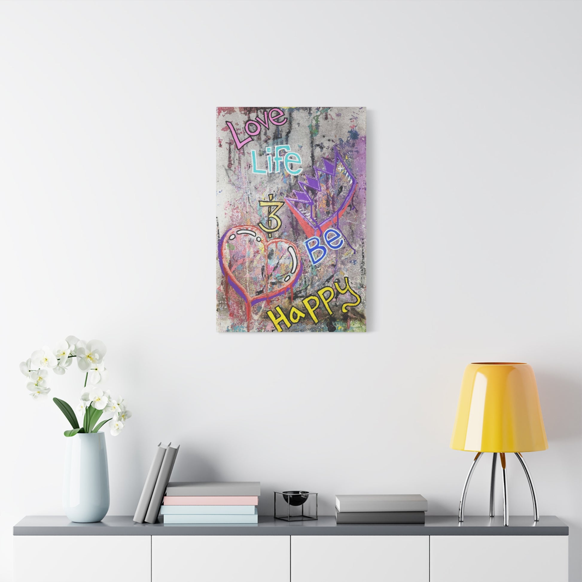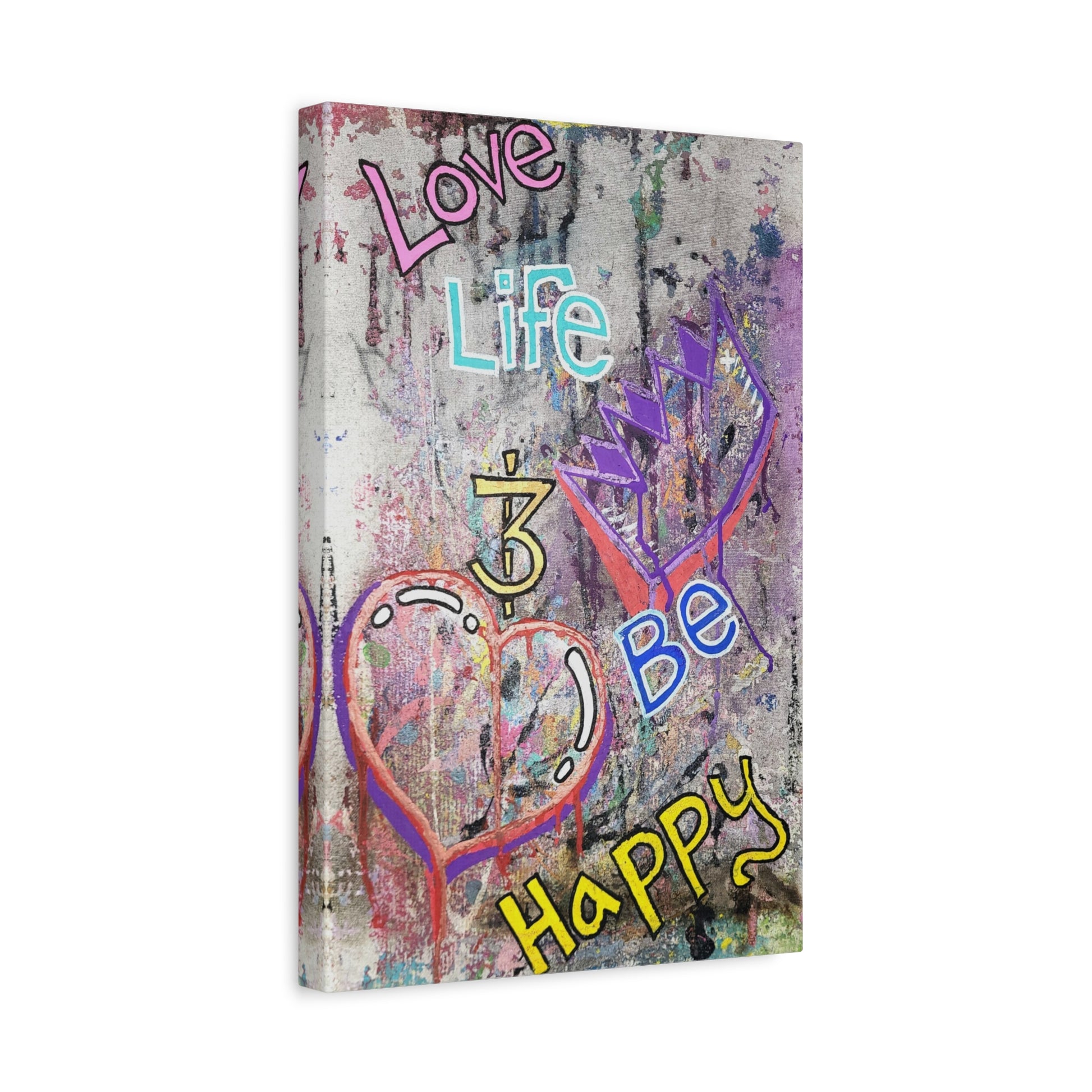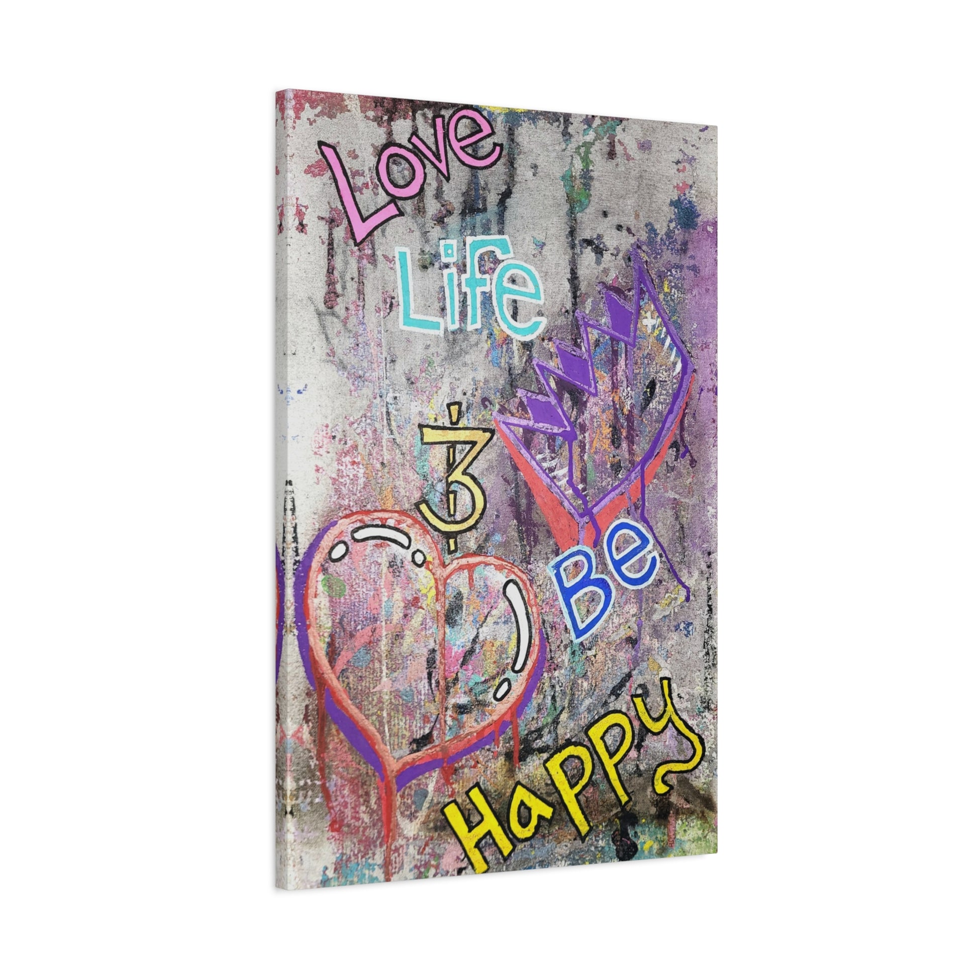 This stretched matte canvas captures a raw, layered story—where controlled destruction meets stubborn hope. The background’s décollage-style texture shows torn, burned, and ghosted layers of paint, giving a tactile, lived-in surface that whispers of risk and repair. Over that rough ground, bold pop-art lettering and simple icons—a dripping heart, a crown, and the declaration “Love / Life / Be Happy.”—sit bright and unapologetic. The contrast is the point: chaos left its mark, but the message endures. Hung on a wall, this piece brings an intimate, rebellious warmth to a room—a reminder that beauty can emerge from the messy parts of life.