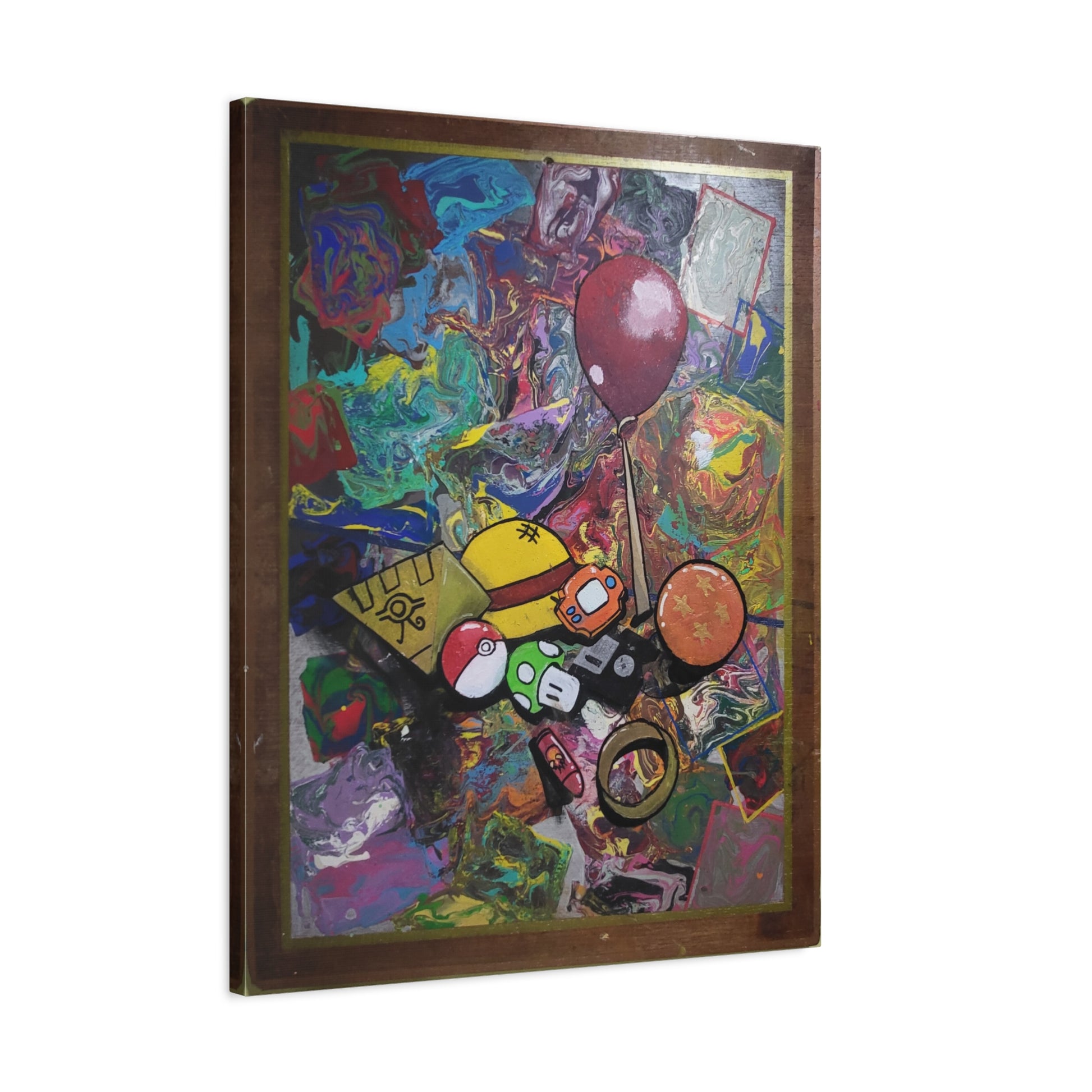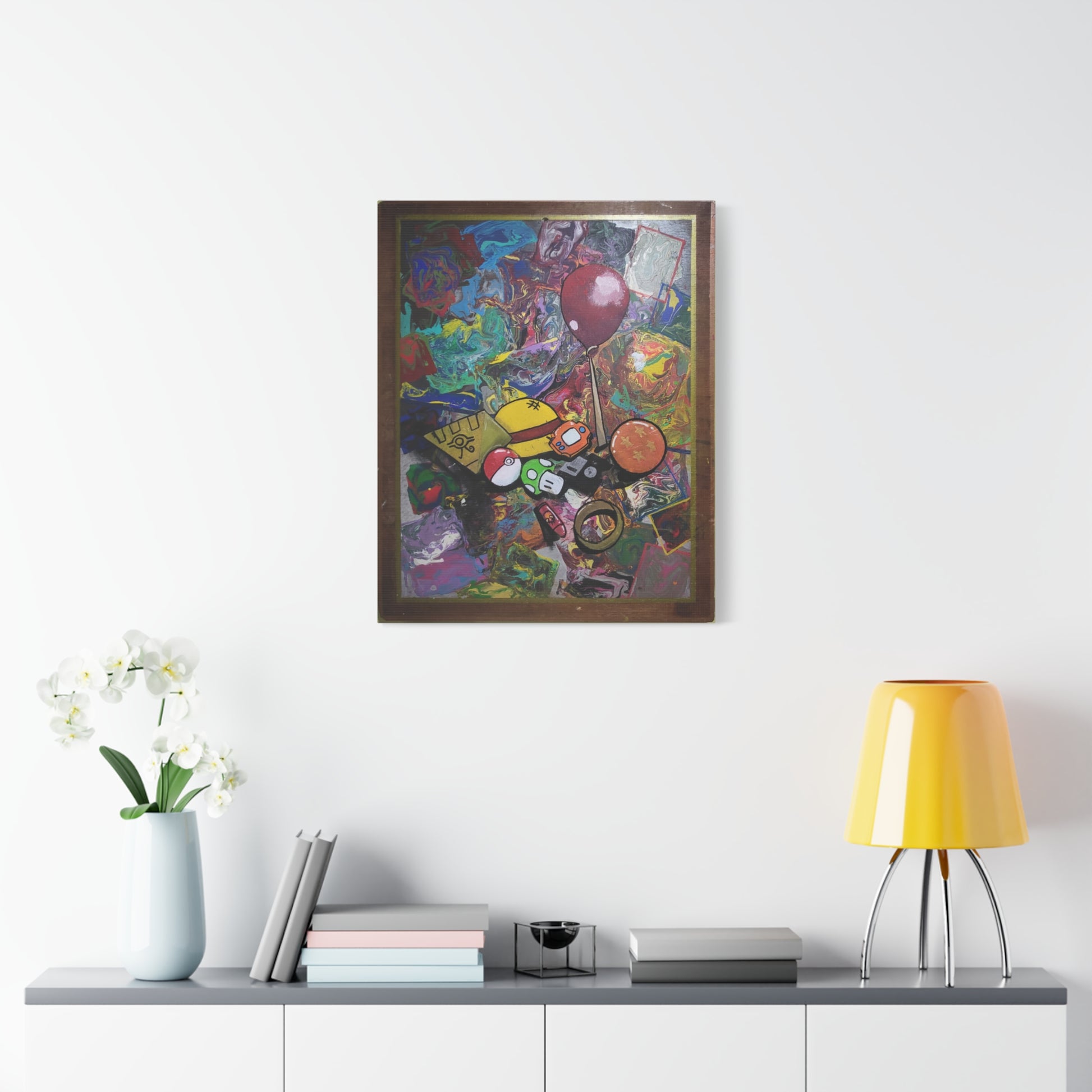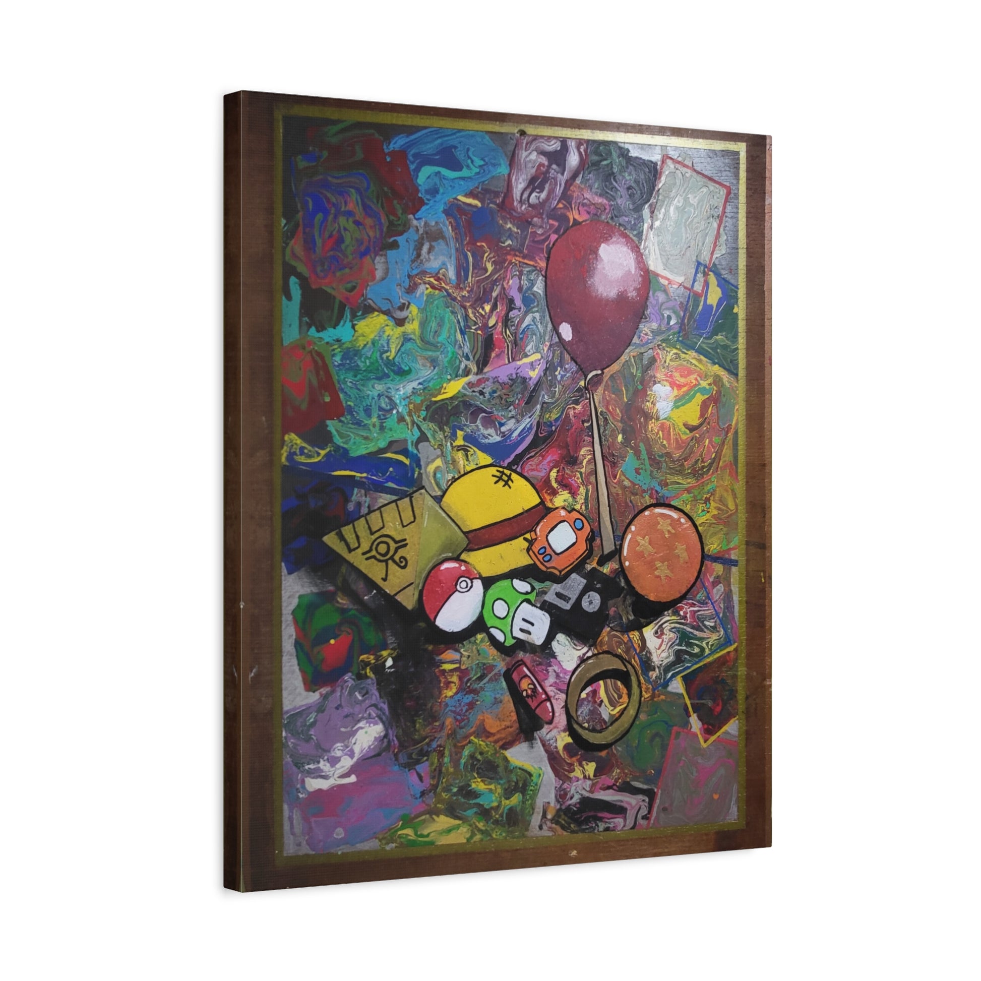 This stretched matte canvas is a playful, nostalgic wall piece that layers a chaotic acrylic pour with a scatter of simple, icon-like objects—little souvenirs from the shows and games that shaped a childhood. The restless, channel-flipping background carries motion and color, while the clean, inventory-style icons sit calmly atop it. Hang it in a game room, studio, or living space to anchor a shelf of memories and spark conversations about late-night marathons, saved games, and the small things that quietly built who you are. The subtle matte finish keeps glare low and the colors rich, so the contrast between the busy backdrop and the tidy tokens reads clearly from across the room.