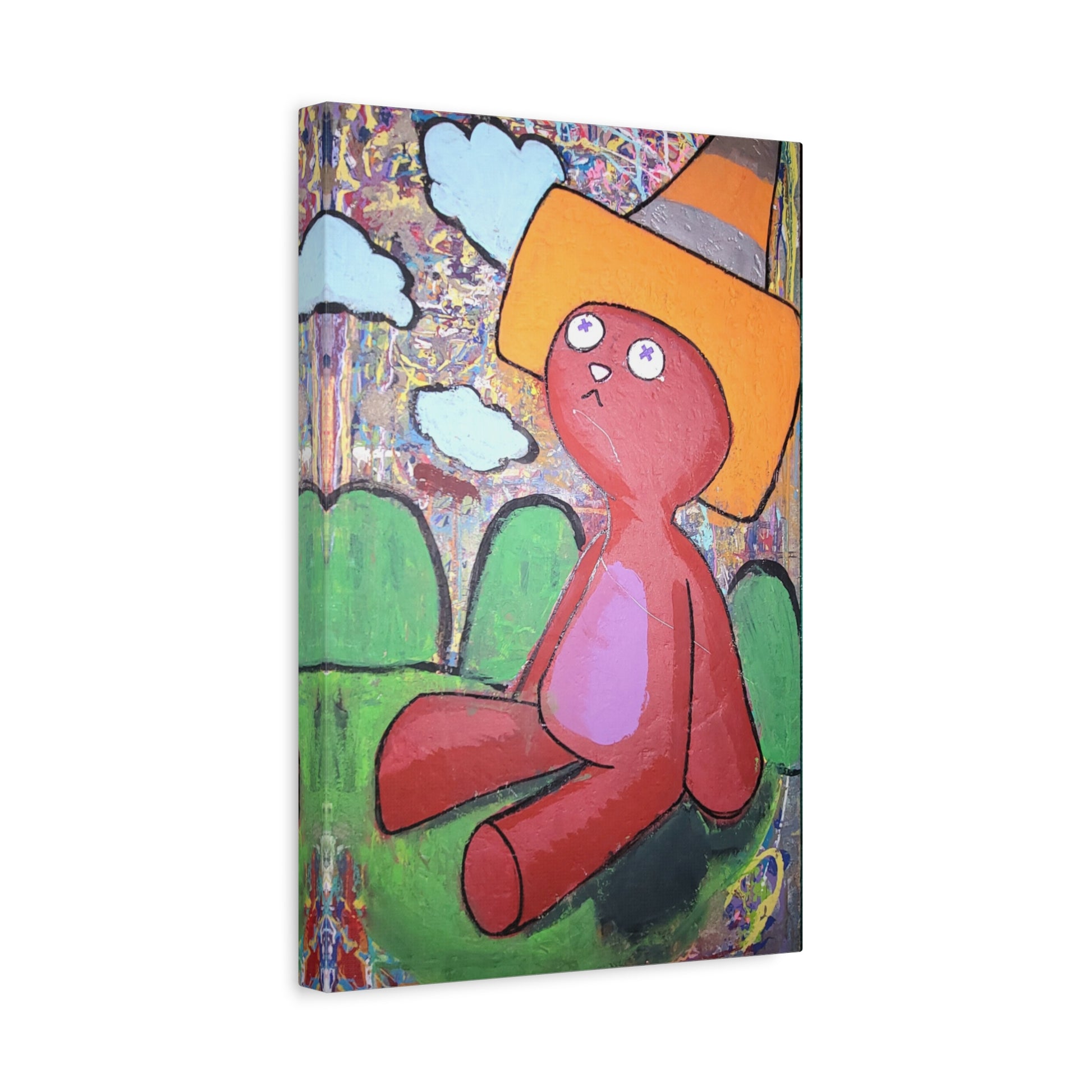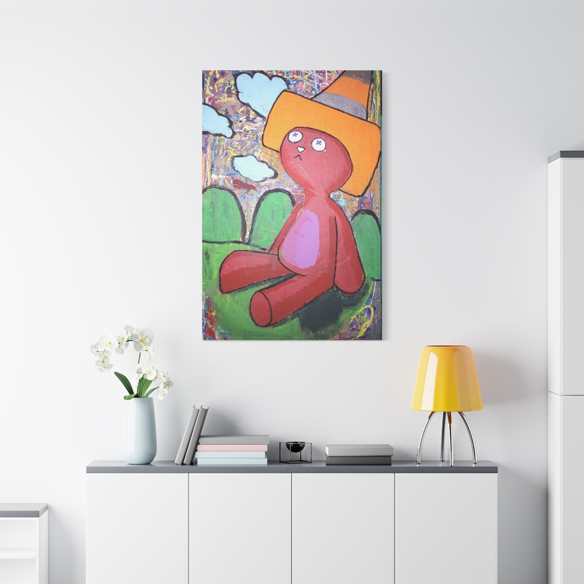 Traffic Kitty arrived fully formed — small, slightly bewildered, and wearing a traffic cone like a tiny crown. This stretched matte canvas captures that quiet, oddball moment: a deliberately blank, halfway-lost expression set against a scraped, messy field of color. Thick black outlines, chunky green hills, and simple clouds sit atop the chaotic background, creating a calm mascot in the middle of visual noise. Hang it where you need a gentle, humorous pause — a hallway that gets too busy, a home office that needs a soft spot of absurdity, or a living room that celebrates the strange and tender. It reads like a quiet person at a loud party: funny, a little sad, and unexpectedly comforting.