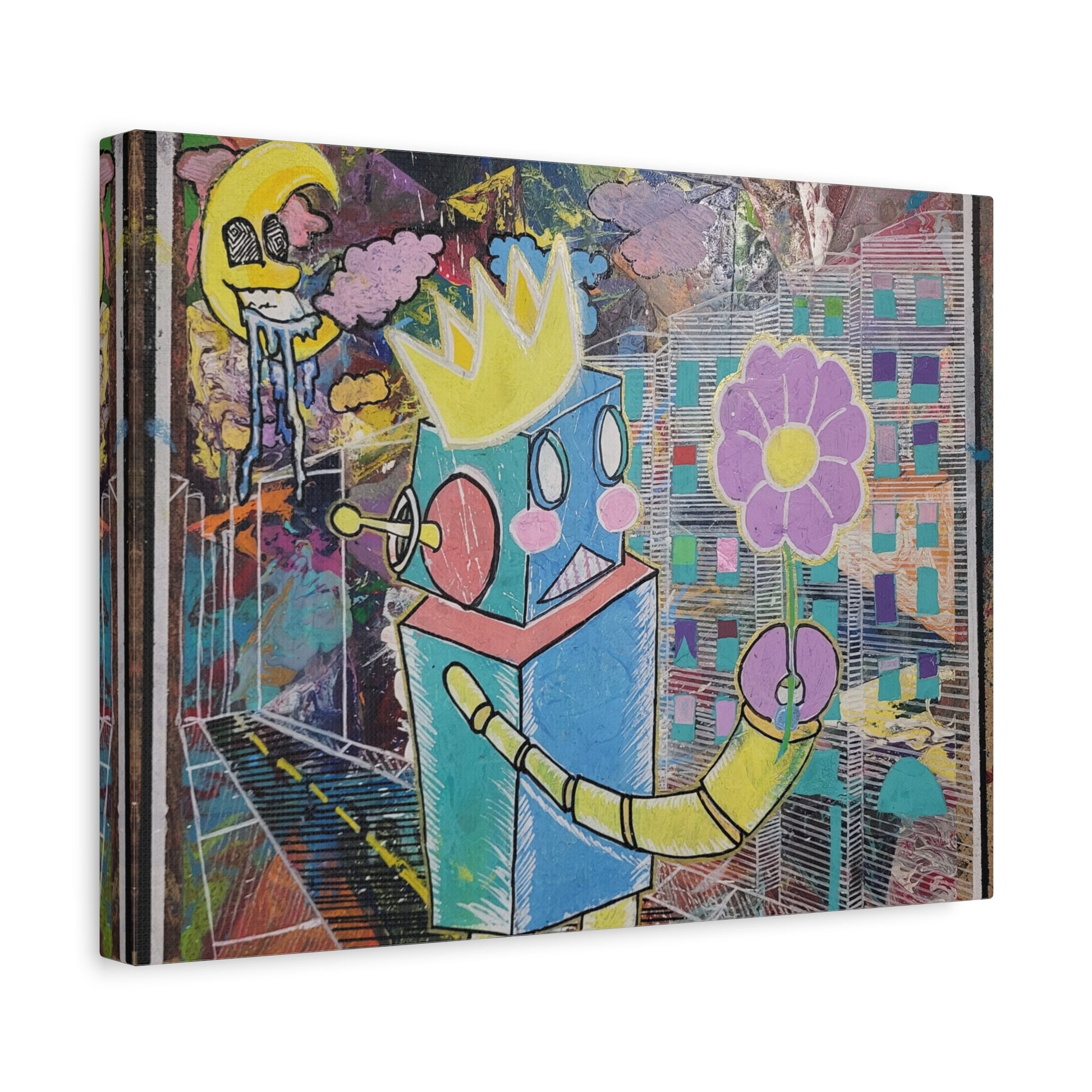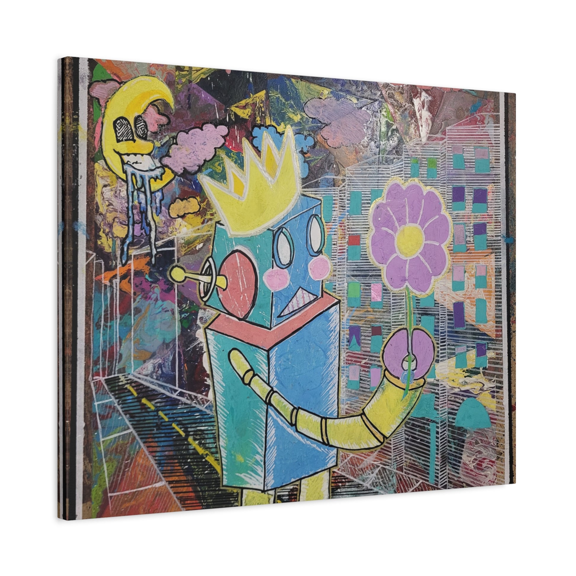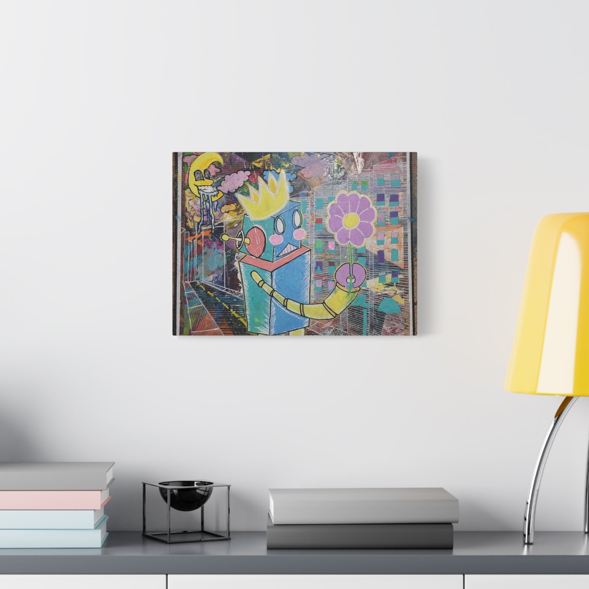 This stretched matte canvas print captures a playful, nostalgic moment with a hand-painted feel. A toy-like blue and yellow robot stands against a chaotic, colorful triangular background created by layered dirty pours, its thick gold outline lifting it from the abstract noise. The robot holds a single flower, offered just off-frame, while a ghostly white cityscape sketch floats above the paint—adding depth without covering the vibrant texture beneath. The overall mood is lighthearted and curious, a balance of spontaneity and careful composition that invites quiet wonder on a wall.